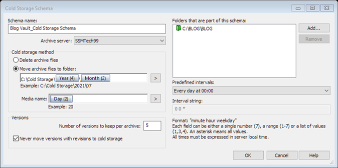 Finally, we need to configure the cold storage schedule. The interval is formatted Minute Hour Day. The drop list allows for the selection of a number of pre-configured options, or for the selection of a user defined scheme where: