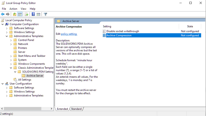 To enable archive server compression on the server, we recommend using the SOLIDWORKS PDM administrative policy. If you have multiple vaults however and do not want to apply compression to them all, you can instead add the registry key that activates the compression manually for each vault.