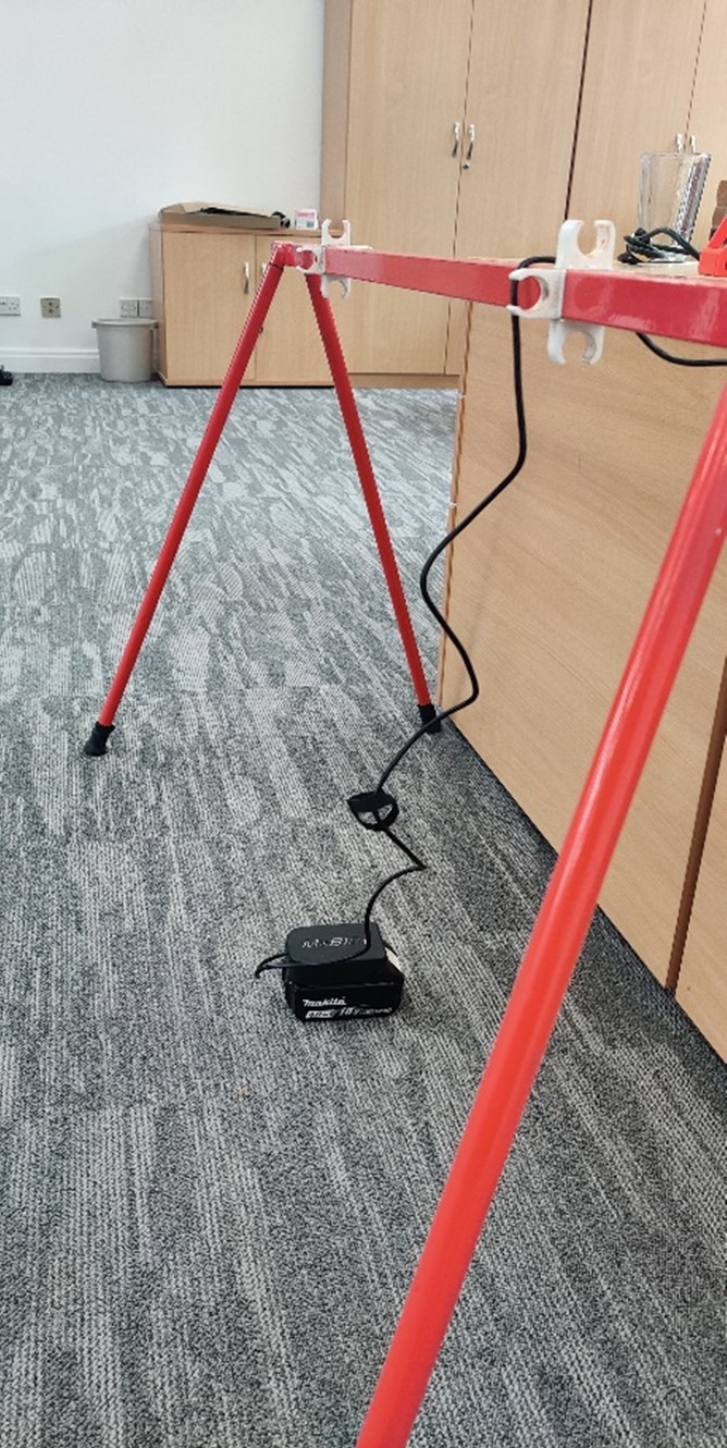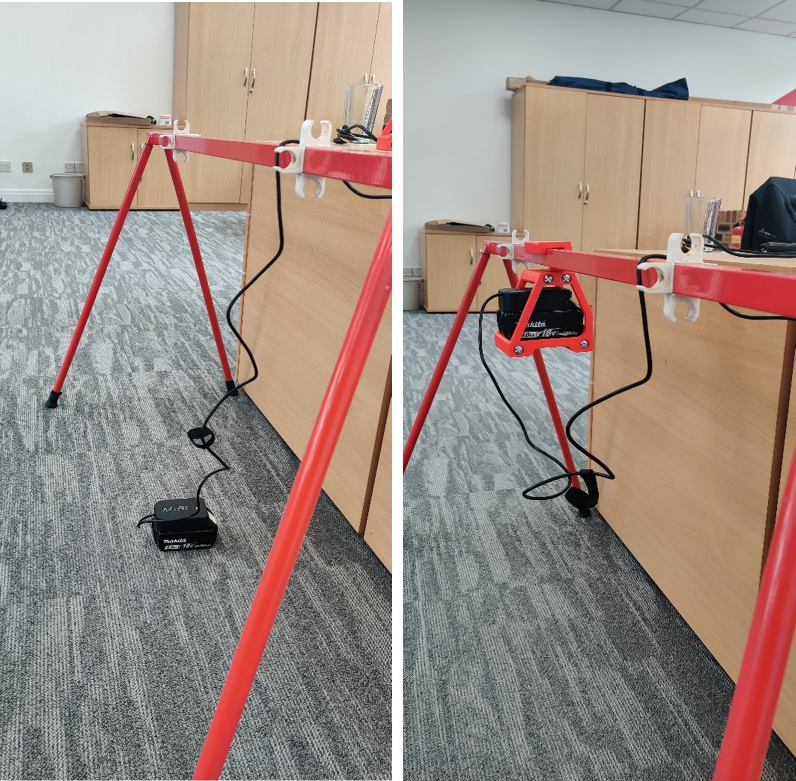 Recently, my manager Jon purchased a mains powered ski sharpening tool, which includes an adapter to make use of a drill battery when away at competitions. The nature of the ski sharpener is such that the battery adapter, positioned at the end of a 1.5m long wire, does not have a suitable place to sit when sharpening ski’s. The setup is also too big to fit in any pockets, and so is left to sit on the floor. (See picture)