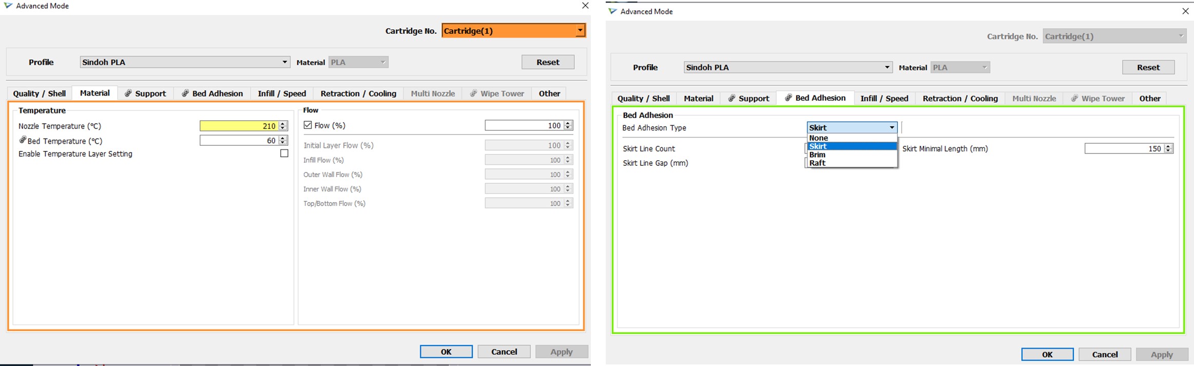 The 3D printer software also allows for the orientation of the part and position on the print bed to be set. Again, this was useful to remove any overhangs which could be caused by the counterbore holes. For each part, a G-code was created; the G-code is essentially a set of instructions the 3D printer reads and follows.