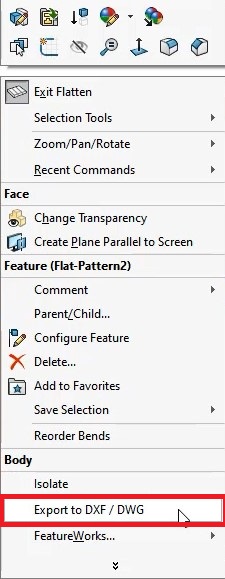 With the model prepared, the next step was to export a DXF for laser cutting. The export process is straightforward, simply right click on the desired flat face, select Export to DXF/DWG from the menu and choose a location to save the file to.