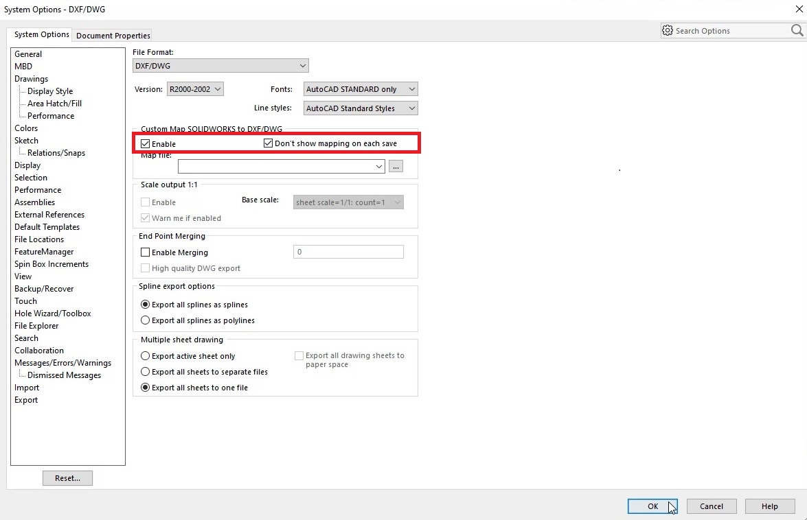 Before clicking save within the file browser, check the export system options. Make sure that custom maps are enabled, and select the option to not show mapping on each save.