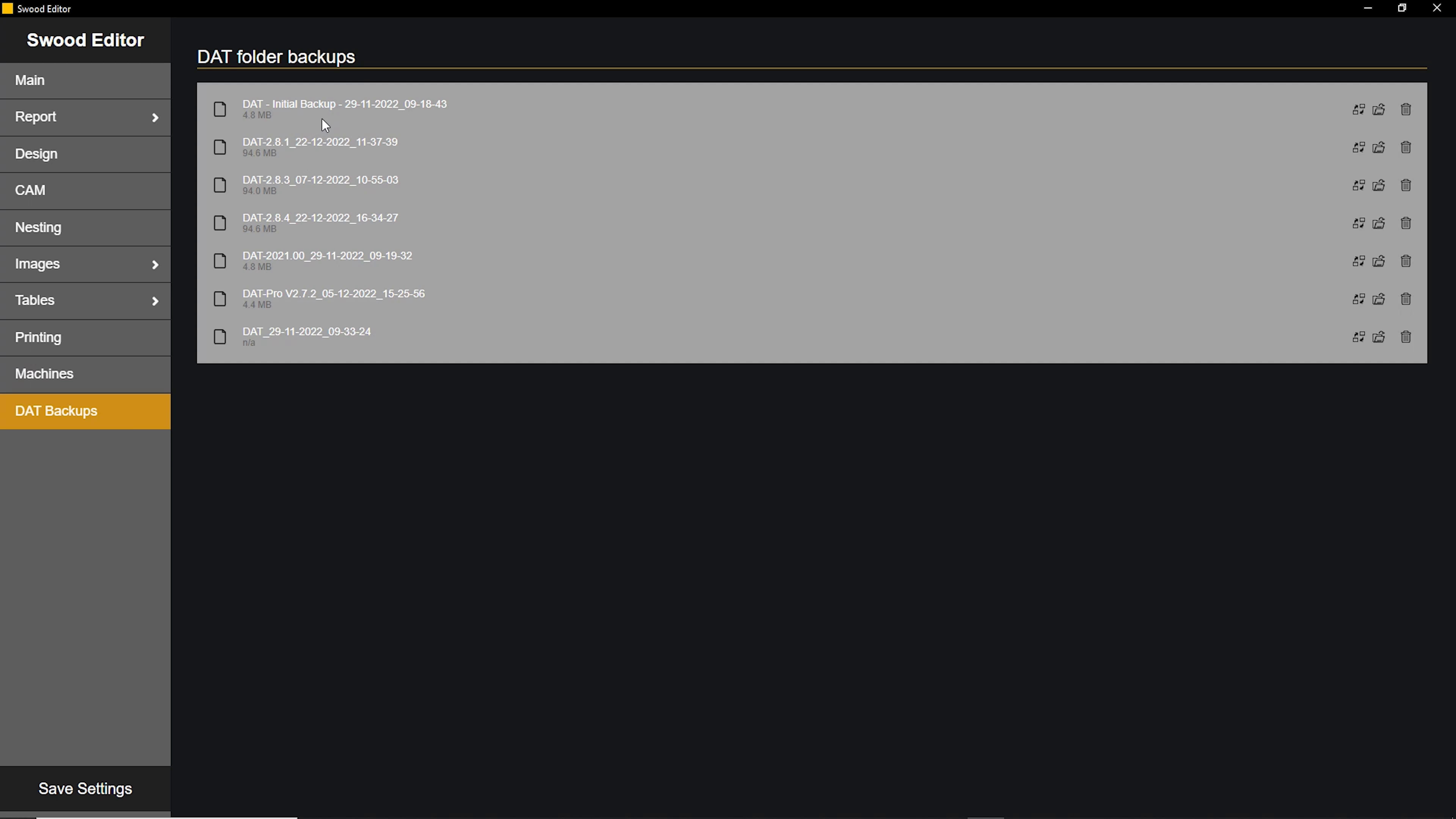 We recommend creating a backup of your settings using the Create Backup button. Backup history is saved to the DAT Backups menu.