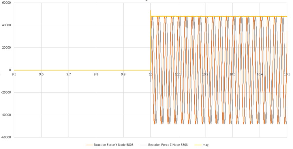 Looking at the reaction forces at the base of the shaft we can see at the moment the blade is deactivated the lateral reaction forces in the constraint that represents the shaft bearing change dramatically as the rotor becomes imbalanced.
