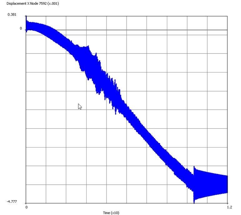 Tip displacement and an animation of the system showing the automatic removal of the elements selected from the solution at t=10s. If we were interested in the effects of different blade fractions or multiple blade-loss scenarios we could save a lot of time by writing a restart file after the end of the spin up simulation and restart multiple different jobs from that with different failure conditions.