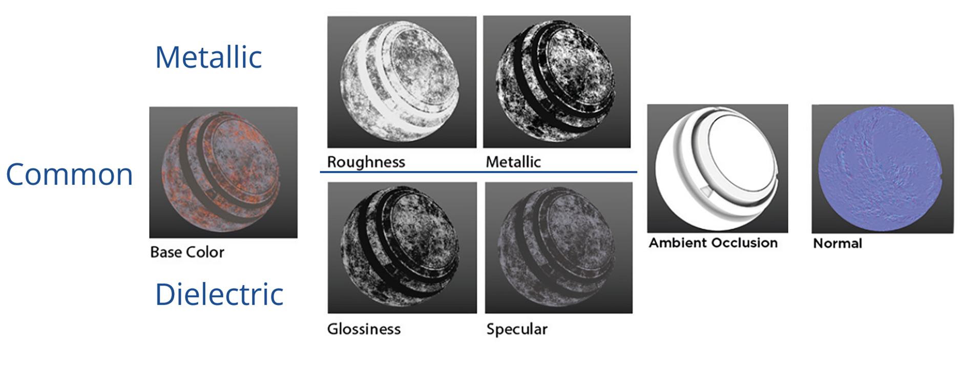 These 5 texture maps are broken down into the base, ambient occlusion, normal map – and depending on whether it is a metallic appearance or not, roughness and metallic or glossiness and specular.