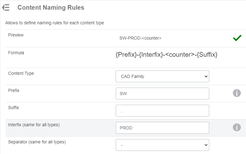 A preview of the generated name during saving to the 3DEXPERIENCE platform. This utilises a sequential counter, a chosen prefix, suffix or interfix, and a separator to build a file name that is applied when a file is saved to 3DEXPERIENCE. This can be customized for different file types being saved into 3DEXPERIENCE.
