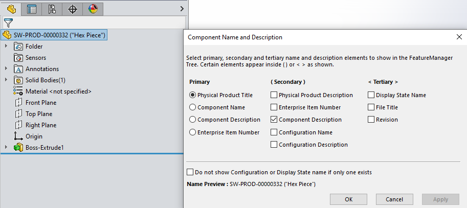 Titles can be edited from the FeatureManager Tree in SOLIDWORKS or the properties view in the 3DEXPERIENCE add-in. Title forms the backbone of duplicate name checks inside 3DEXPERIENCE, as an option can be switched on to force title uniqueness.