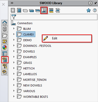 In the SWOOD Design tab of the task pane, select the connectors icon to show the library, then right click anywhere in the task pane window and click Edit.