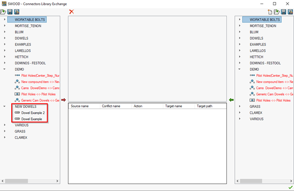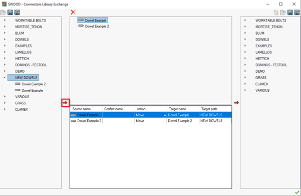To transfer the two connectors in the New Dowels folder we can either select them both in the tree, or select the folder itself, and then click the arrow pointing to the central section of the window.