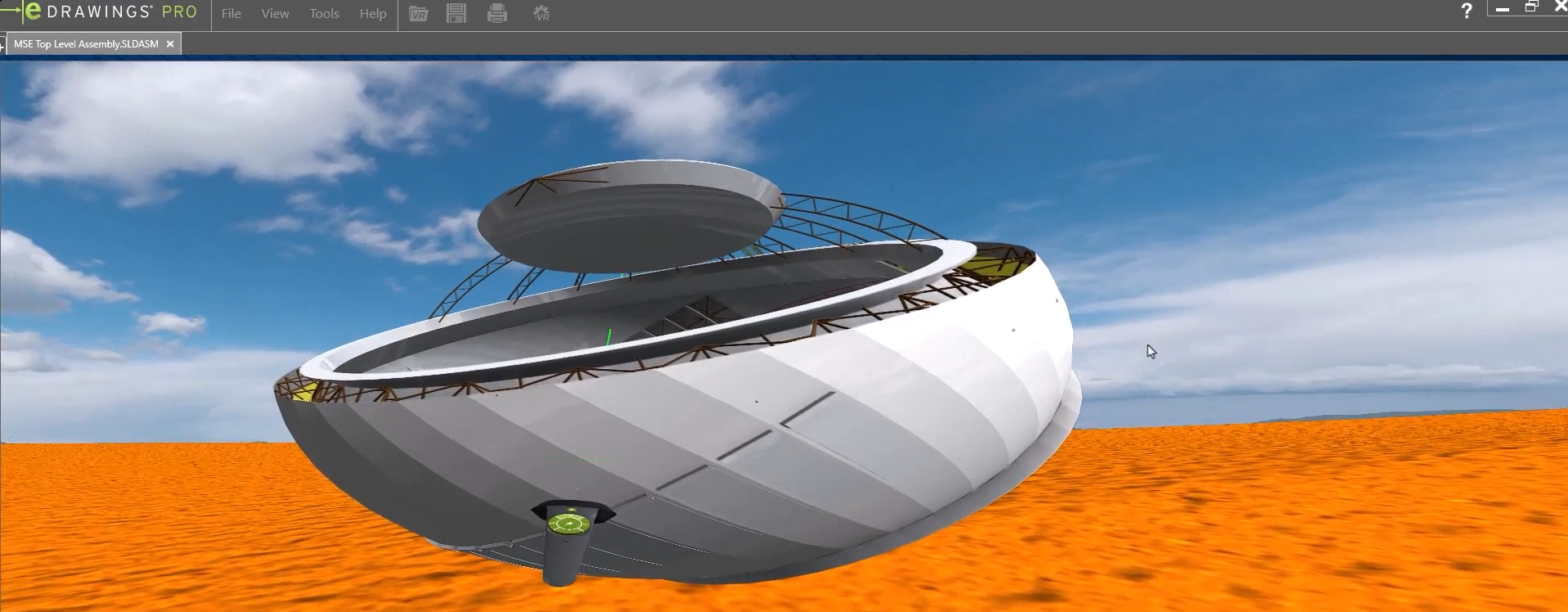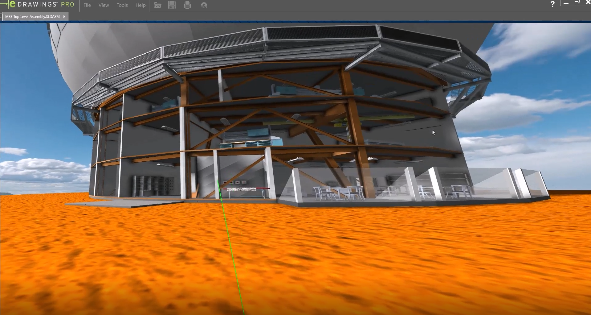 Once you open your SOLIDWORKS designs in eDrawings VR mode you will see your 3D model – in our example we have some telescopes and terrain – and then the virtual environment around it.