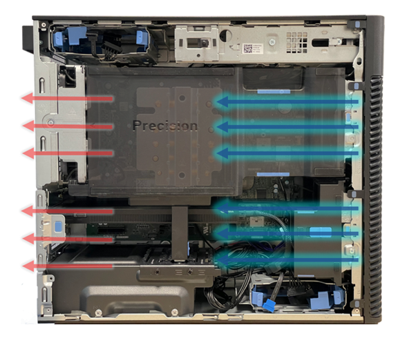 In a typical desktop setup, cold air is drawn in at the front and exhausted out of the rear of the system, however the Dell 3680 provides a lot of potential for re-circulating hot air from the increasingly powerful components.