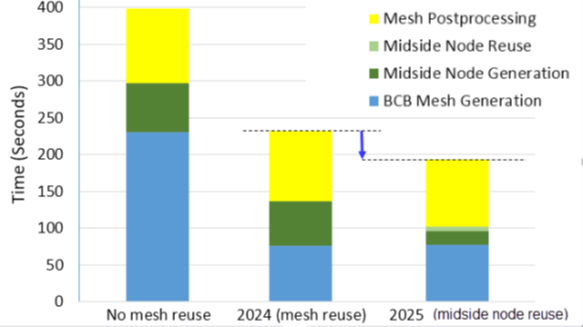 This functionality has been further enhanced in 2025 as midside node positions (in high quality elements) across identical parts are reused, giving further performance improvements for an even quicker meshing time. The following graph shows the improvement over the last three years for the same assembly containing 450 parts.