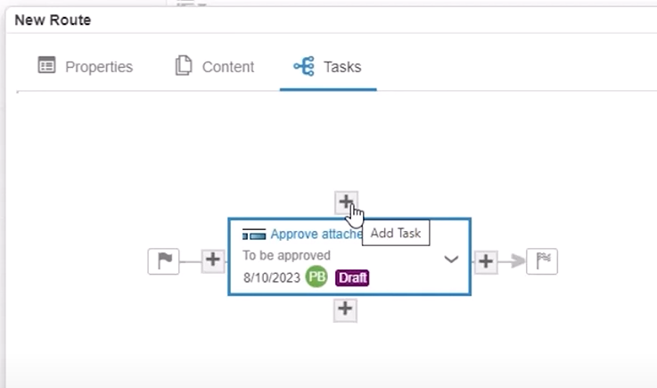 Once a designer has finished making some modifications to a file, they can create a new approval route and use the newly created template to create the route. Be sure to review the properties and content tab before confirming, but the tasks tab will already be populated thanks to the template.