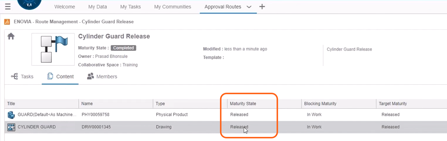 As an example, we will build a controlled approval route for a part and its associated drawing which currently lie in the ‘in work state’.