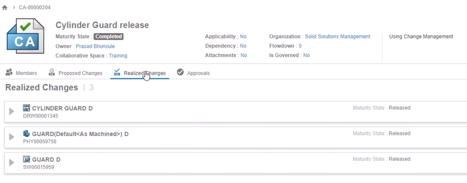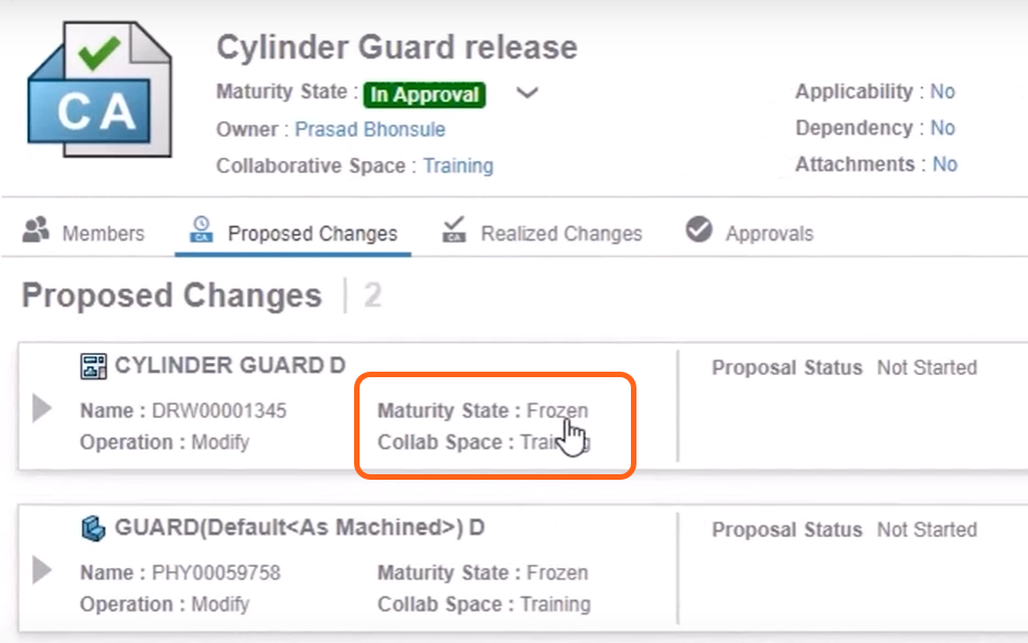 We can use the realized changes tab to see the changes of maturity state for each item, and the approvals tab will show the progress at each stage.