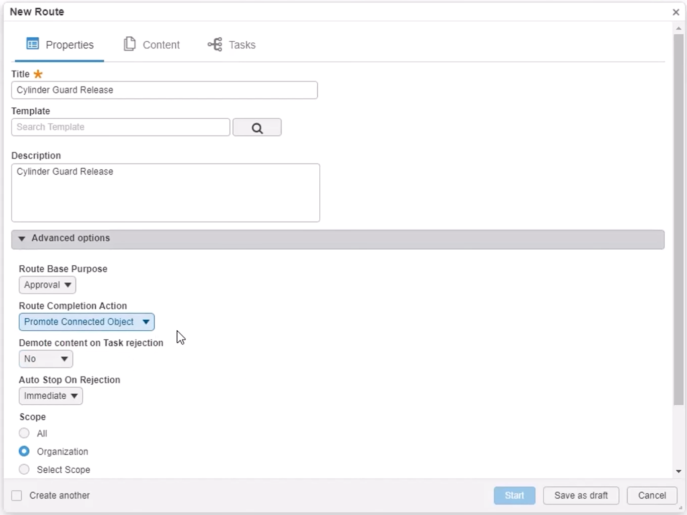 In this case, we will select ‘Promote connected Object’ to ensure that the maturity of any attached items will be promoted to released on completion. We will leave the rest of the settings as default.