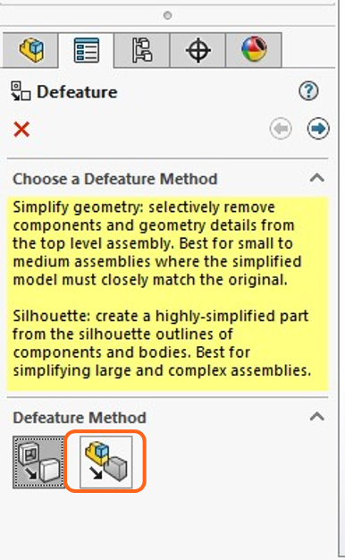SOLIDWORKS 2024 introduced the ability to defeature using the 'Silhouette' option.