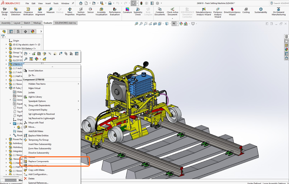 We'll use the model of this track-setting machine to demonstrate how to use the defeature tool as it has a subassembly that we would like to defeature.