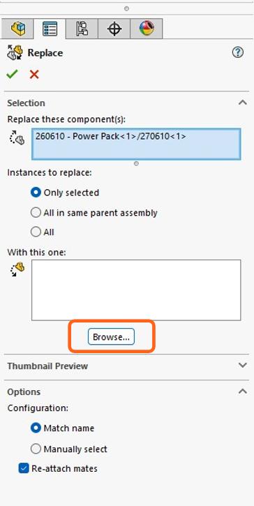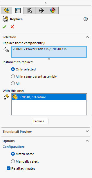 Select 'Match name' and reattach mates and confirm the replace by hitting the green tick.
