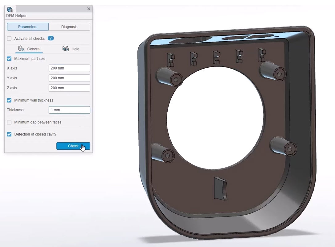 The design phase now integrates essential tools for manufacturing. The Design for Manufacturing (DFM) helper checks part size, wall thickness, hole depth, and other factors crucial for transitioning seamlessly from design to production.