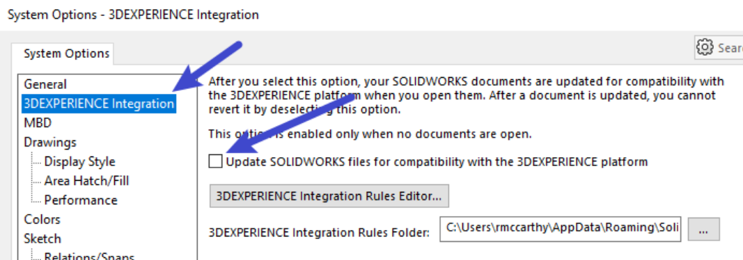 - Go to Tools → Options → System Options → 3DEXPERIENCE Integration.