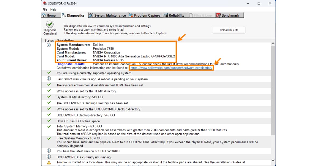 Click the hyperlink in the Diagnostics tab to open the SOLIDWORKS Hardware Certification page.