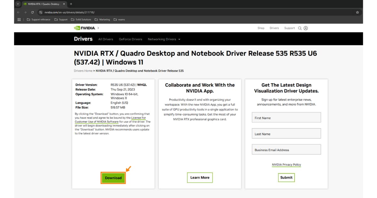 Follow the instructions on the page to download the installer for the latest certified driver. These can be surprisingly large files, so be patient with the download if needed, and save the file on your local drive.