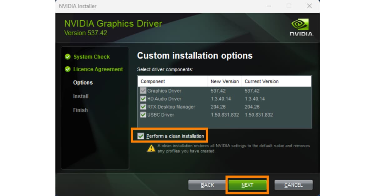 Tick 'Perform a clean installation', then click Next. Your monitors or laptop screen may flicker or go black briefly during this process - fear not, that is expected behaviour as the graphics card is effectively rebooting!