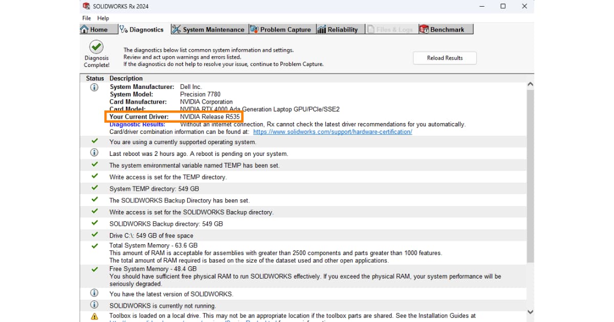 Re-open SOLIDWORKS Rx and verify that the updated driver is now in use.