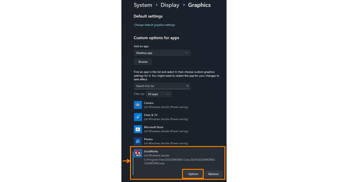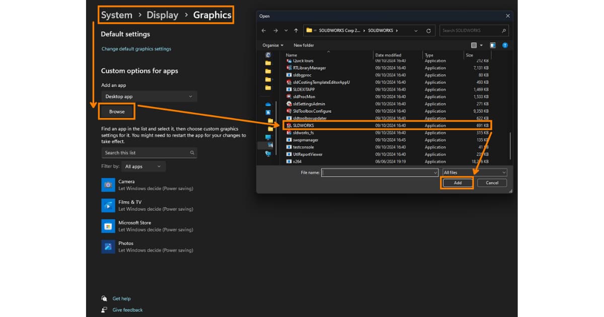 2. Under 'Graphics performance preferences', click Browse and navigate to your SOLIDWORKS executable file