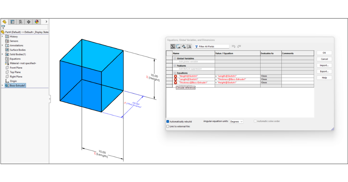 This loop creates a circular reference. SOLIDWORKS will display the affected equation in red text. When you hover over the red "X" icon, the software will indicate that a circular reference exists.