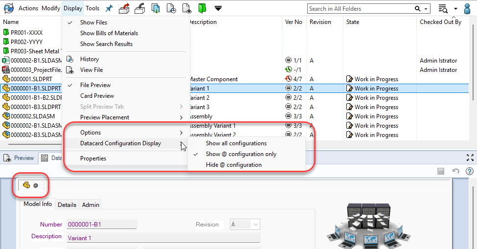 Via the Display menu, users may individually configure the display of configurations in data cards, while accessed in the SOLIDWORKS PDM File Explorer by clicking ‘Display’, choosing ‘Datacard Configuration Display’, and selecting one of the following: