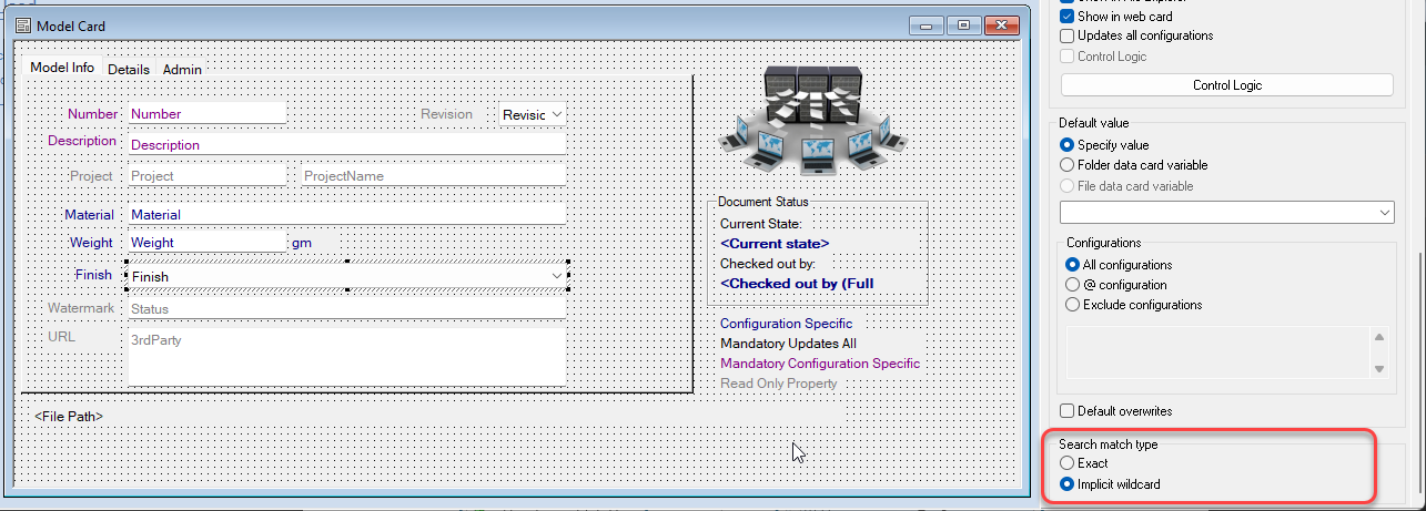 The option to specify the ‘Search Match Type’ as either ‘Exact’ or ‘Implicit Wildcard’ is defined on the control within the file card (not the search card) and offers the following behaviours: