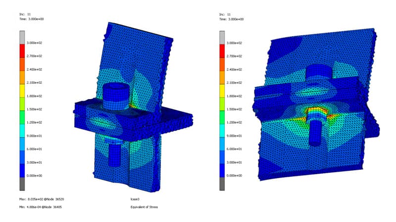 In the subsequent Local models we can include detailed models of the bolts with pre-tensioning effects and Marc is able to map the 2D displacement results for the global shell model to local 3D meshes for some of the bolts in order to understand what’s happening in detail.