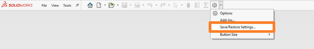 To backup your SOLIDWORKS settings, head to the dropdown next to Settings > Save/Restore Settings. This will launch the Copy Settings Wizard.