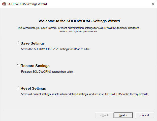 Before performing a registry reset, we always recommend taking a backup of your current SOLIDWORKS settings. This makes it straightforward to restore them if needed.