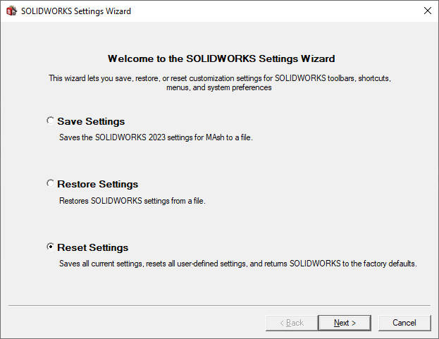 SOLIDWORKS 2023 streamlined the registry reset process. The SOLIDWORKS registry can now be reset directly through the Copy Settings Wizard.