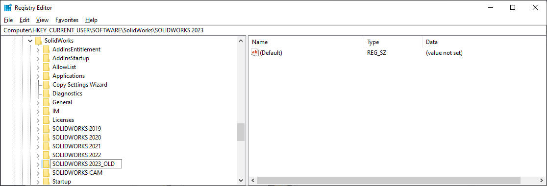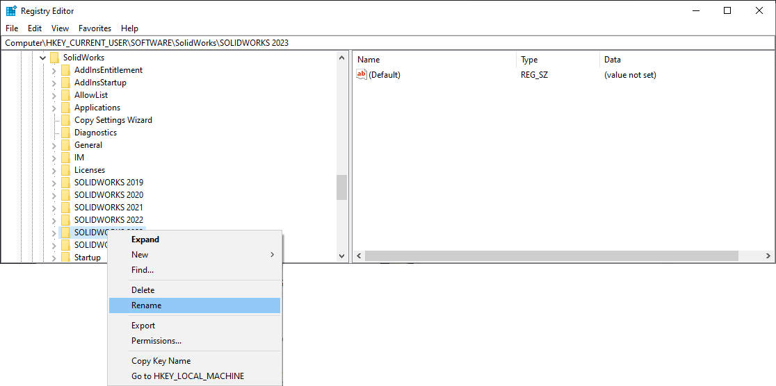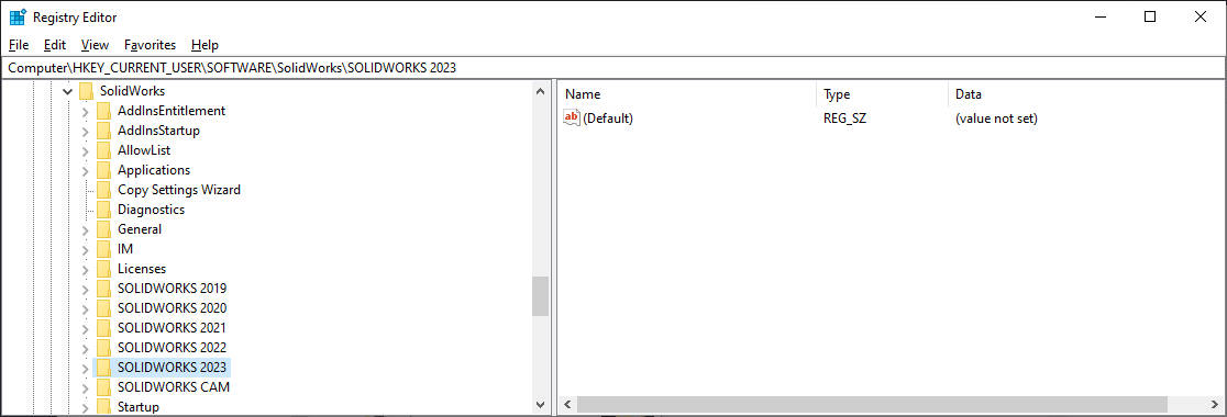 If you aren’t using SOLIDWORKS 2023 or later, the registry needs to be reset through the Windows Registry Editor.