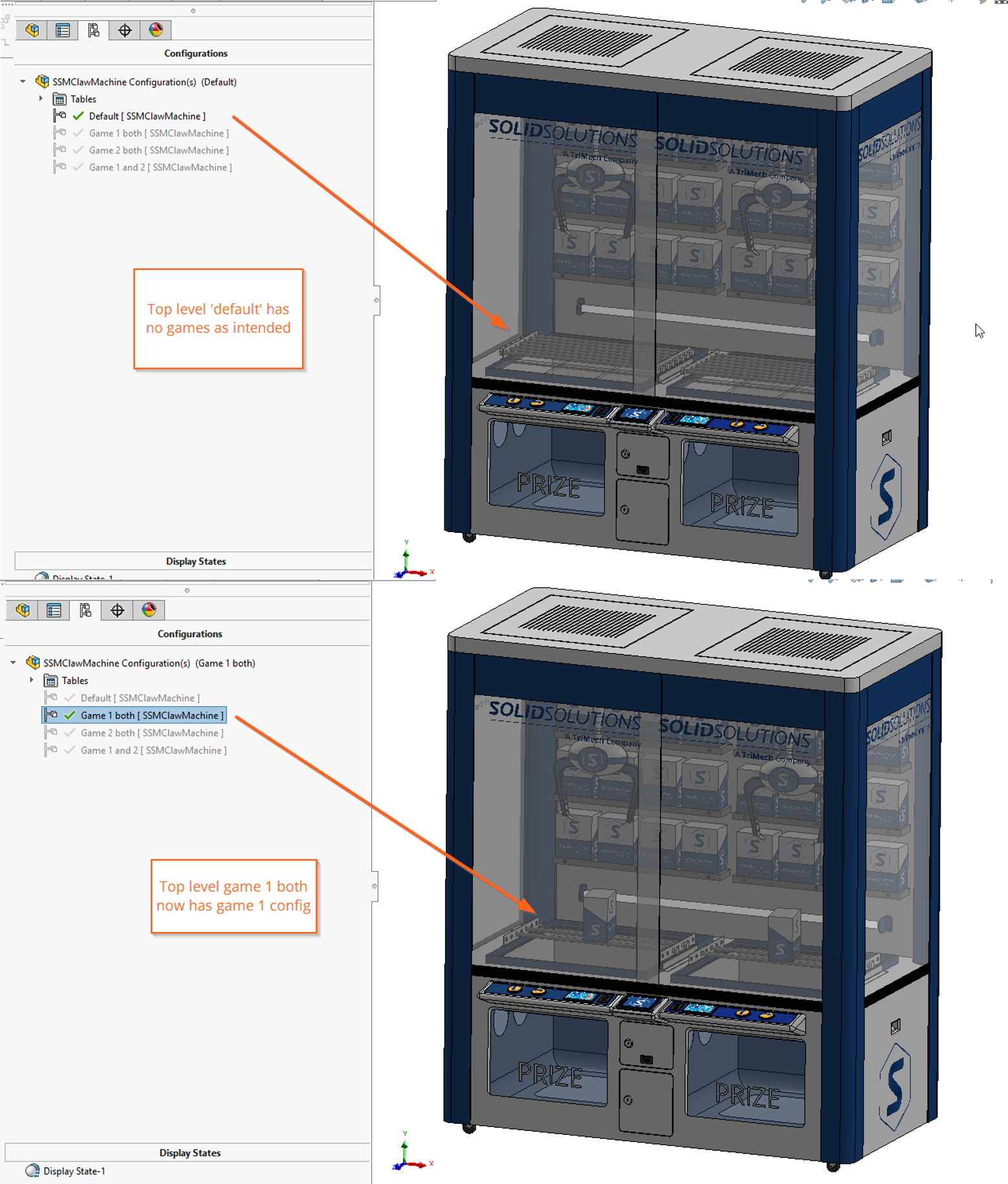 The default configuration is now showing the ‘Game 1’ subassembly configuration. The problem here is that the game subassembly sits within another subassembly layer. Currently there is only one ‘default’ configuration for this subassembly and as a result, all configurations of the top level will only ever show one version of the game configurations.