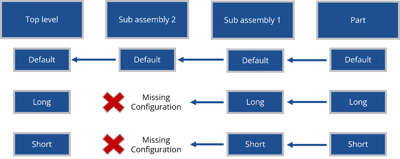 - Track through assemblies to ensure each subassembly layer has appropriate configurations.